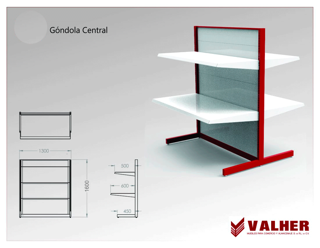 Gondola Central con respaldo en mdf multiperforado, 4 entrepaños y señalizador en Trovicel.