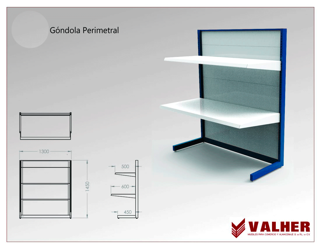 Gondola perimetral con patas a piso, con respaldo metálico sin plataforma o piso.